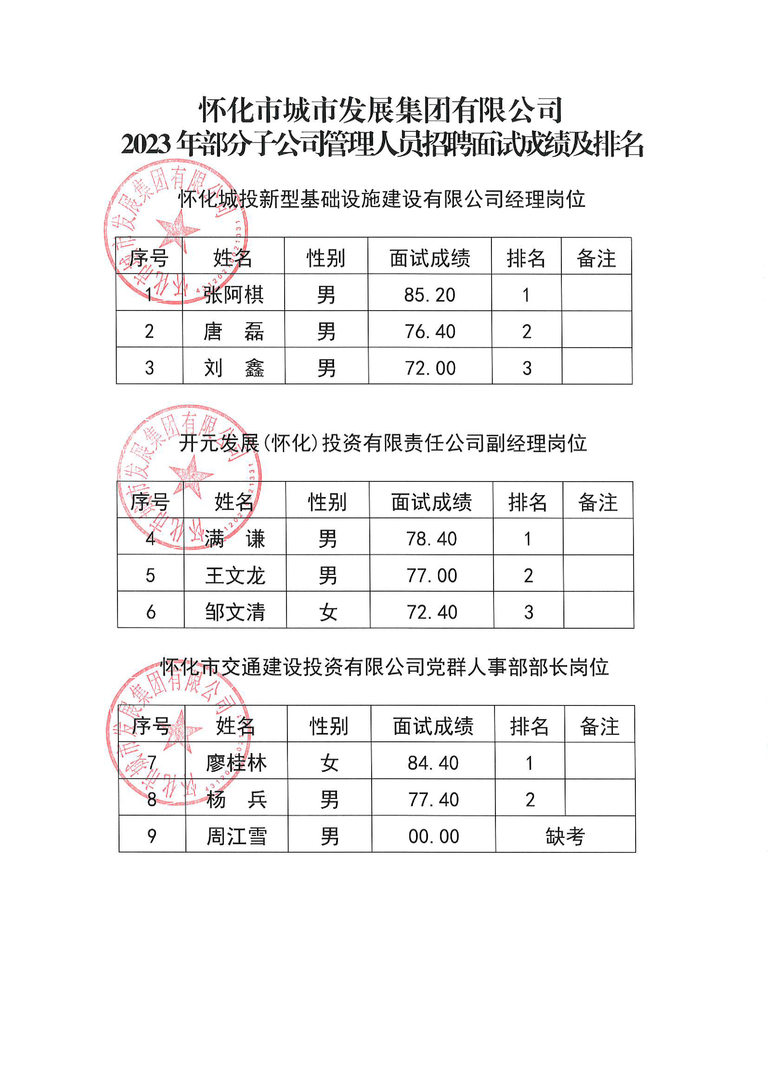 懷化市城市發展集團有限公司2023年部分子公司管理人員招聘面試成績及排名