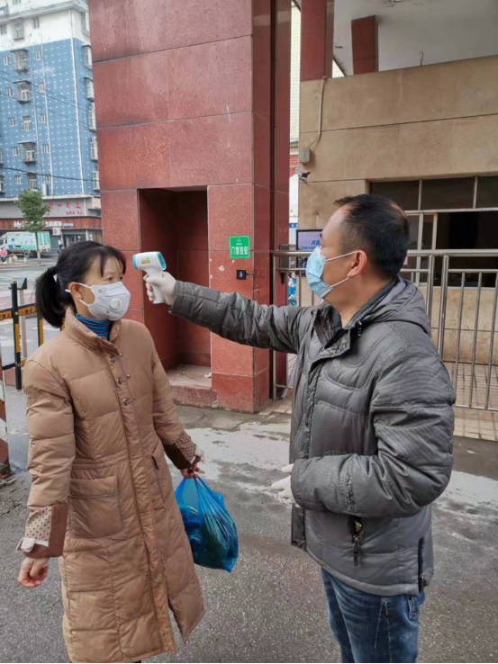 2月4日,突擊隊員為小區進出人員檢查體溫