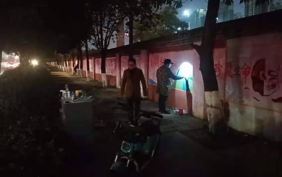 工人加班對(duì)圍墻進(jìn)行彩繪美化裝點(diǎn)