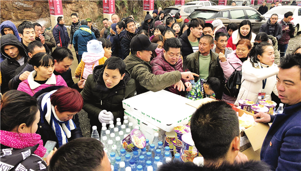 1月28日,洪江市組織工作人員在邵懷高速公路安江出口為被困乘客免費發放餅干、方便面和飲用水等食品。由于嚴寒低溫天氣,邵懷高速洪江市路段大面積結冰,安江出口20 余輛大巴車被困。該市立即調撥救援物資,幫助被困群眾。(楊錫建 向華 攝)