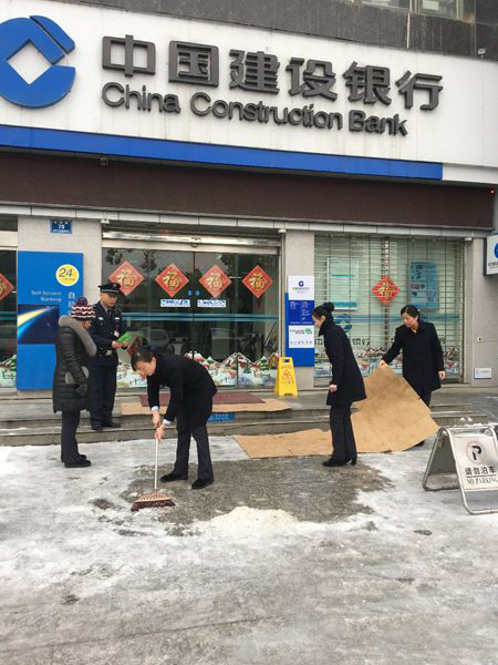 1月25日,建行懷化分行網點啟動應急預案,鏟冰掃雪、鋪設紅地毯,進一步做好冰災期間營業網點的客戶服務工作(王承 攝)