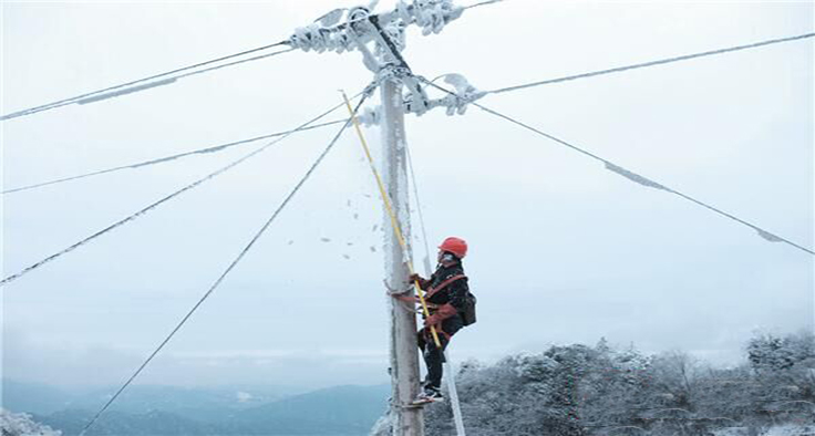 2018年12月31日上午10時,國網芷江供電公司工作人員在海拔1008米的明山頂峰進行上桿除冰作業。連日來,為保障人民群眾生產生活用電,該公司派出精干力量巡視129人次,特巡線路28條次,排除險情47處。(郭志剛 龔衛國 攝)