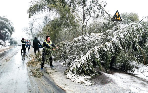 1月16日,受雨雪天氣影響,308省道麻陽(yáng)呂家坪鎮(zhèn)塘坊段道路兩側(cè)竹木被壓彎,侵占道路,影響道路通行。呂家坪鎮(zhèn)政府組織相關(guān)人員及時(shí)清理,確保道路暢通。(胡啟球 張青求 攝)
