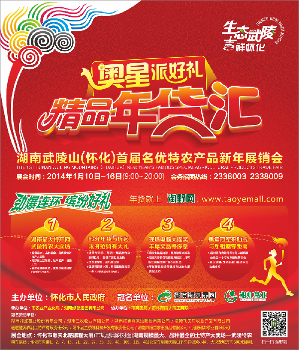 2014湖南武陵山(懷化)首屆名優特農產品新年展銷會期間市民免費入場,全場特賣低至5折,滿三百還有神秘禮品相送,持抽獎券可搖獎。