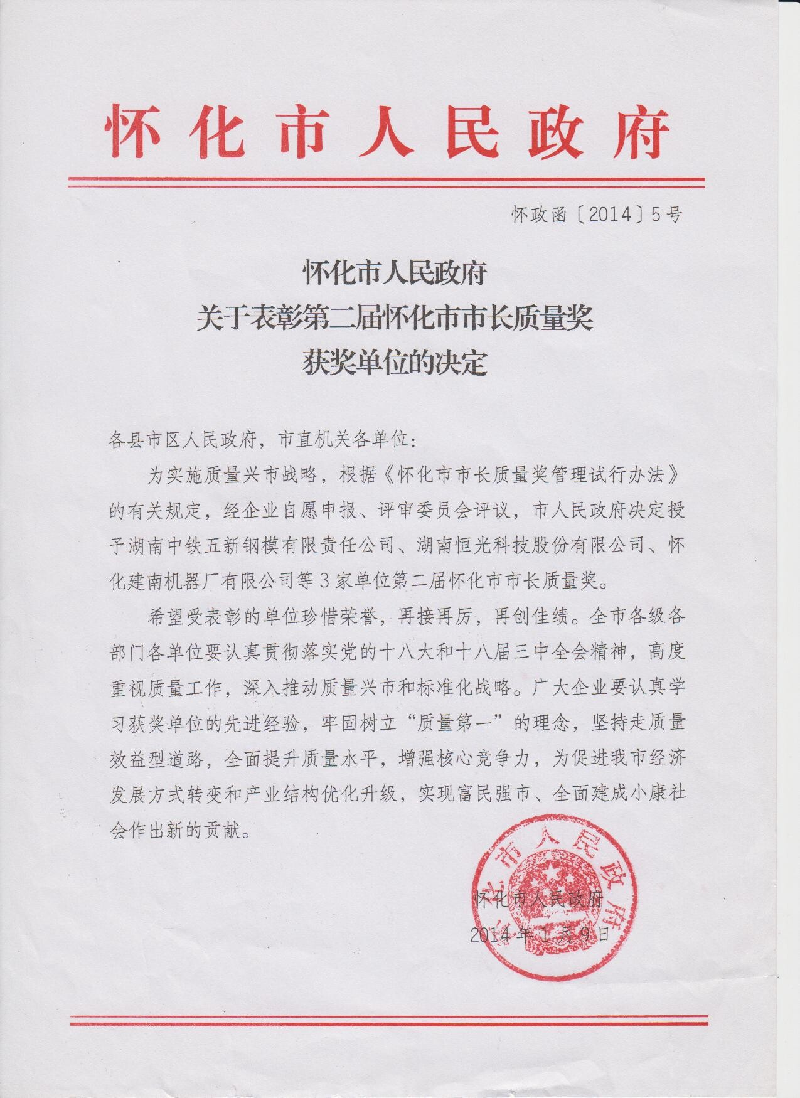 自2011年頒發首屆懷化市市長質量獎以來,全市各級各部門,各企業迅速掀起了質量興市熱潮,廣泛開展了學習貫徹落實以《卓越績效評審準則》國家標準和市內外先進企業成功質量管理經驗為重點的質量強市活動,我市質量工作得到了很好的發展,為進一步推進質量興市戰略,2013年我市根據《懷化市市長質量獎試行管理辦法》的有關規定,經企業自愿申報、評審委員會評議,市人民政府決定,授予湖南中鐵五新鋼模有限責任公司、湖南恒光科技股份有限公司、懷化建南機器廠有限公司等3家單位第二屆懷化市市長質量獎。