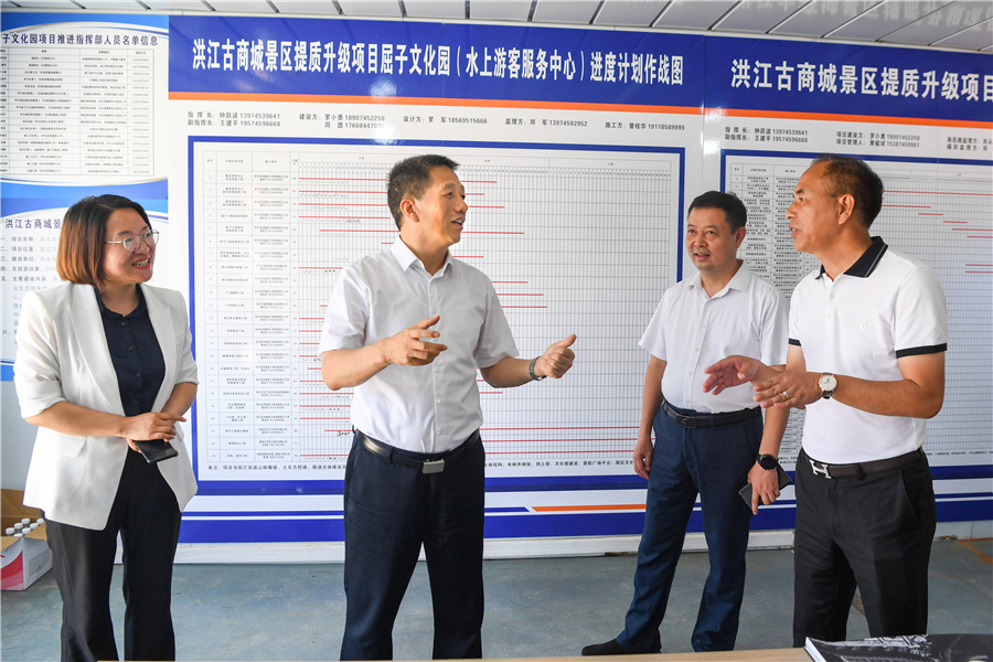 (許忠建在洪江古商城了解屈子江閣、水上游客服務(wù)中心等景區(qū)提質(zhì)改造項目進(jìn)展情況。以上照片均由懷化日報全媒體記者 楊智偉 攝)