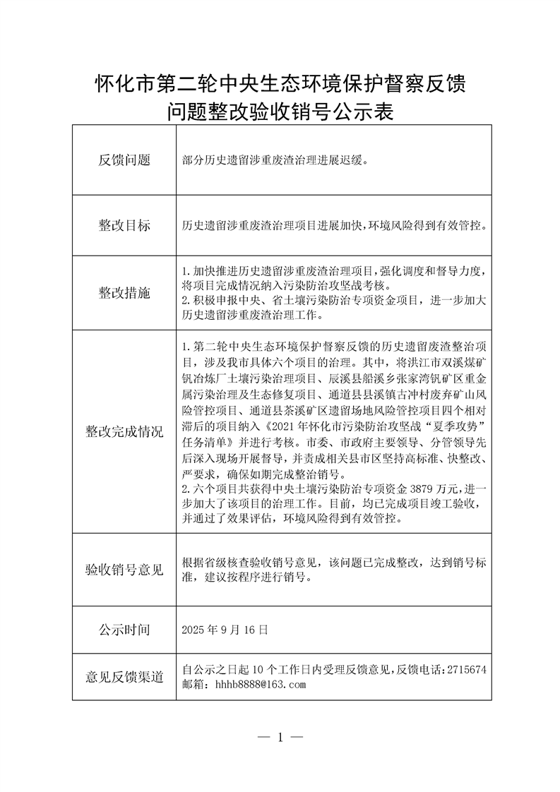 懷化市第二輪中央生態(tài)環(huán)境保護(hù)督察反饋問(wèn)題整改驗(yàn)收銷號(hào)公示表