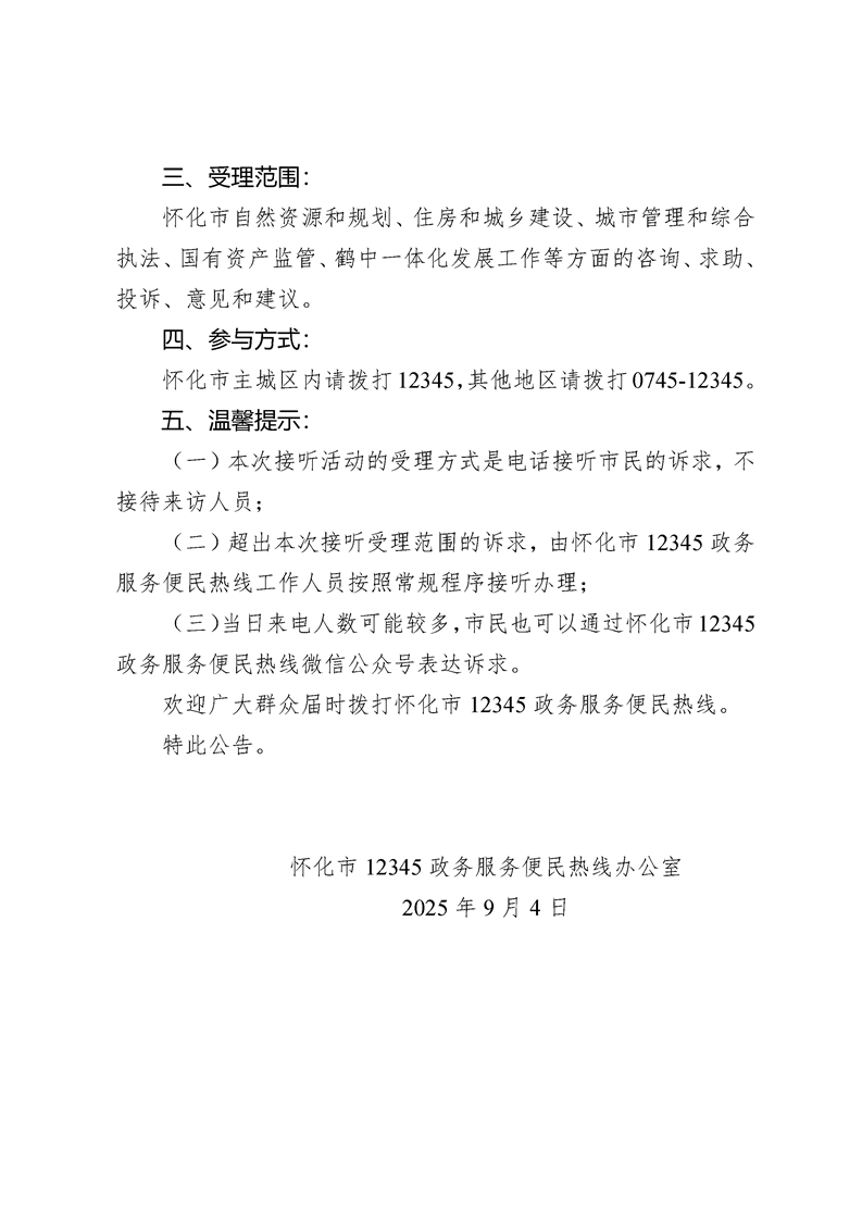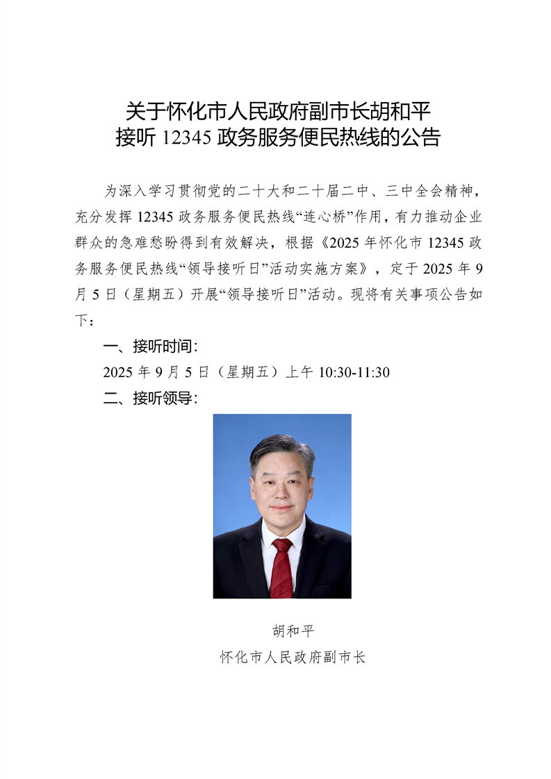 關于懷化市人民政府副市長胡和平接聽12345政務服務便民熱線的公告