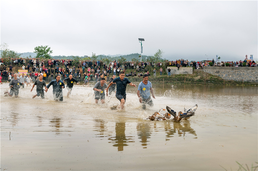 9月23日,中國農(nóng)民豐收節(jié),會同縣的稻香詩田景區(qū)內(nèi)一派歡騰景象,成為慶祝豐收的熱鬧主場。田埂間稻浪翻滾,空氣中彌漫著清甜的稻香,一場場充滿鄉(xiāng)土氣息與歡樂氛圍的活動在此輪番上演——激昂的斗牛舞踏著鼓點躍動,金黃的草龍舞在人群中蜿蜒穿梭,拔河比賽的吶喊聲此起彼伏,還有趣味十足的抓鴨子游戲,讓參與者在追逐與歡笑中共享豐收的喜悅,將秋日的田園變成了一片歡樂的海洋。