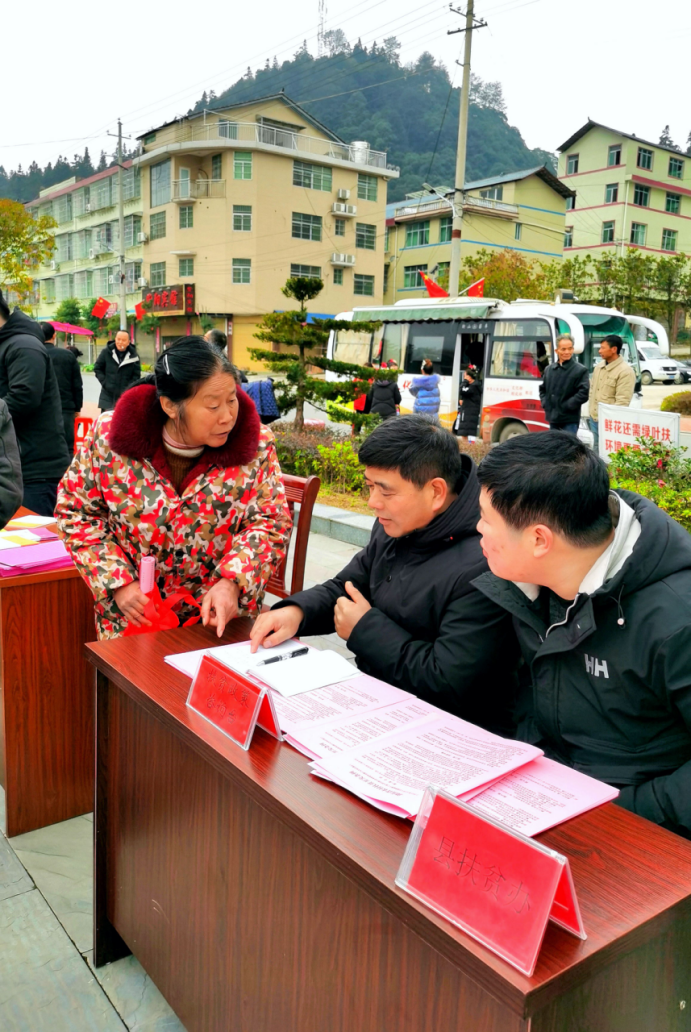 2020年1月13日在會同縣漠濱侗族苗族鄉三下鄉活動現場,工作人員正在為群眾解答扶貧政策。