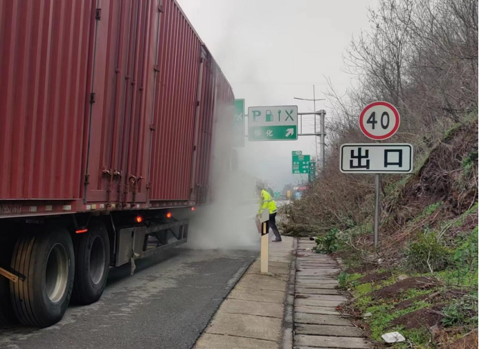 2月9日下午,湖南高速集團懷化分公司麻陽管理所巡查人員在巡查途中,及時發現并制止一輛大貨車右前輪著火冒煙仍在行駛的情況,有效避免了一起車輛自燃事故的發生,為車主挽回巨大經濟損失。