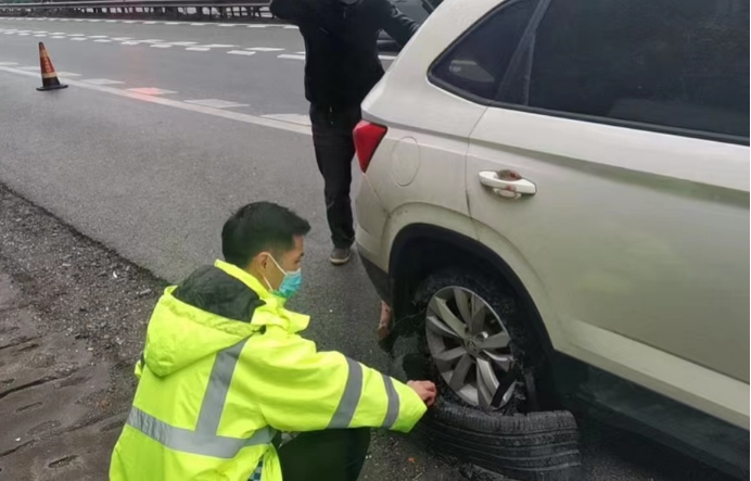 上午9時許,在G60滬昆高速公路東向西方向K1378+650M處,一輛小車因右后輪爆胎停在應急車道上。而司機沒有換胎經驗,只能在原地干著急。所幸雪峰山管理所巡查人員在巡查過程中及時發現,并用隨車維修工具迅速幫其換好輪胎。