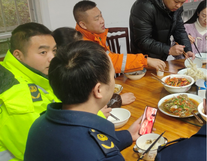 17時,訓練剛剛結束,食堂里就飄來了飯菜香,隊員們才想起:“今天是年夜飯加餐啊,趕緊去洗澡!”隊員們脫去作訓服,豆大的汗珠還掛在額頭就往宿舍跑去。不一會兒,管理所里的同事紛紛來到食堂,圍坐在一起。第一件事竟然是不約而同地拿出手機,有拍照發朋友圈的,更多是與家人視頻通話。