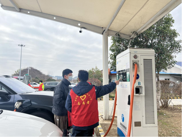 大年初三,外出旅游獲探親訪友的車輛越來越多,考慮到許多司乘人員對充電樁使用生疏,為更好服務司乘朋友,縮短排隊充電時間,新晃片區管理所“路燈”志愿者們一早來到新晃服務區,在電動車充電樁處設置服務臺,對前來充電的司乘人員進行教學示范,保障其快速充電,并送上新年祝福。