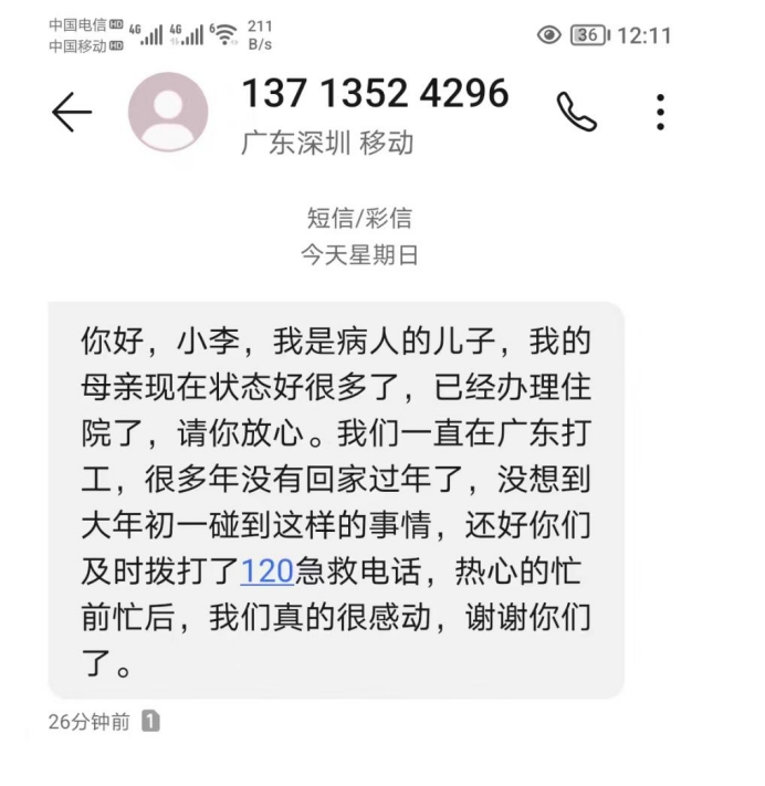 待老人各項體征平穩后,收費班長李高強收到了一條感謝短信,對收費站的暖心幫助表示感謝。