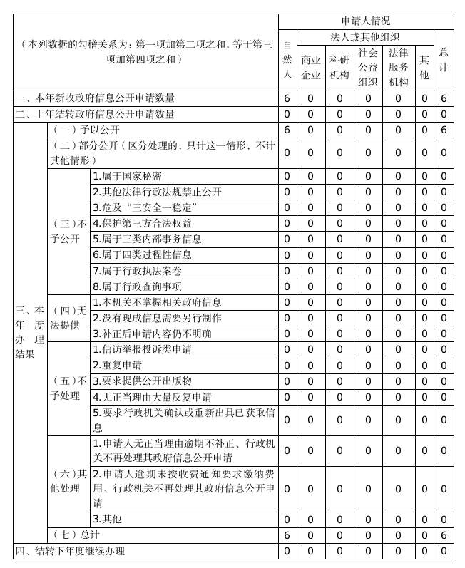 全年收到6件信息公開申請,均已按時辦結。在行政復議、訴訟方面,也未收到有關政府信息公開的行政復議申請,也未發生關于政府信息公開的行政訴訟案件。