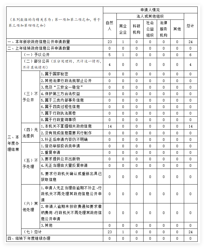 本年度報(bào)告根據(jù)《中華人民共和國(guó)政府信息公開條例》(以下簡(jiǎn)稱《條例》)、湖南省政務(wù)公開領(lǐng)導(dǎo)小組辦公室《關(guān)于貫徹落實(shí)(中華人民共和國(guó)政府信息公開條例)實(shí)施方案》(以下簡(jiǎn)稱《實(shí)施方案》)及《懷化市政府信息公開實(shí)施細(xì)則》(以下簡(jiǎn)稱《細(xì)則》)的有關(guān)規(guī)定,由鶴城區(qū)政務(wù)公開領(lǐng)導(dǎo)小組辦公室編制。全文由總體情況、主動(dòng)公開政府信息情況、收到和處理政府信息公開申請(qǐng)情況、政府信息公開行政復(fù)議行政訴訟情況、存在的主要問題及改進(jìn)措施、其他需要報(bào)告的事項(xiàng)等六部分組成。本報(bào)告的統(tǒng)計(jì)數(shù)據(jù)時(shí)限為2024年1月1日至12月31日,通過(guò)懷化市鶴城區(qū)人民政府門戶網(wǎng)站對(duì)外公布。如對(duì)報(bào)告有任何疑問、意見,請(qǐng)與懷化市鶴城區(qū)政務(wù)服務(wù)中心聯(lián)系(地址:懷化市鶴城區(qū)政務(wù)服務(wù)中心五樓501室,郵編:418000,電話:0745-2338221,電子郵箱:hcqzwzx@126.com)。